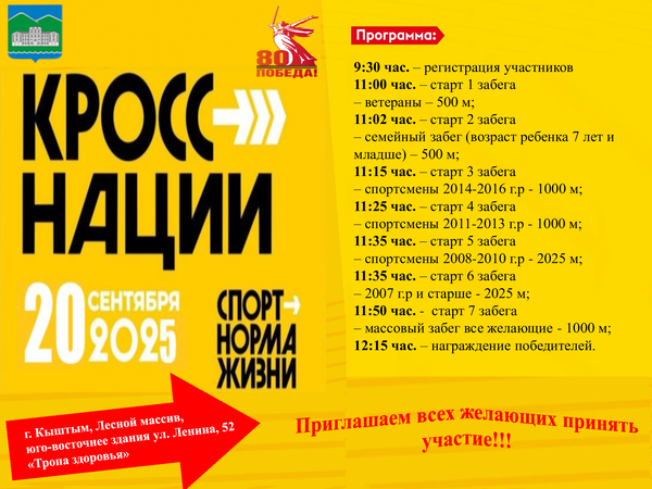 г. Кыштыма приглашает 20 сентября 2025 г. на «КРОСС НАЦИИ — 2025», место проведения: г. Кыштым, Лесной массив, юго-восточнее здания ул. Ленина, 52 «Тропа здоровья».